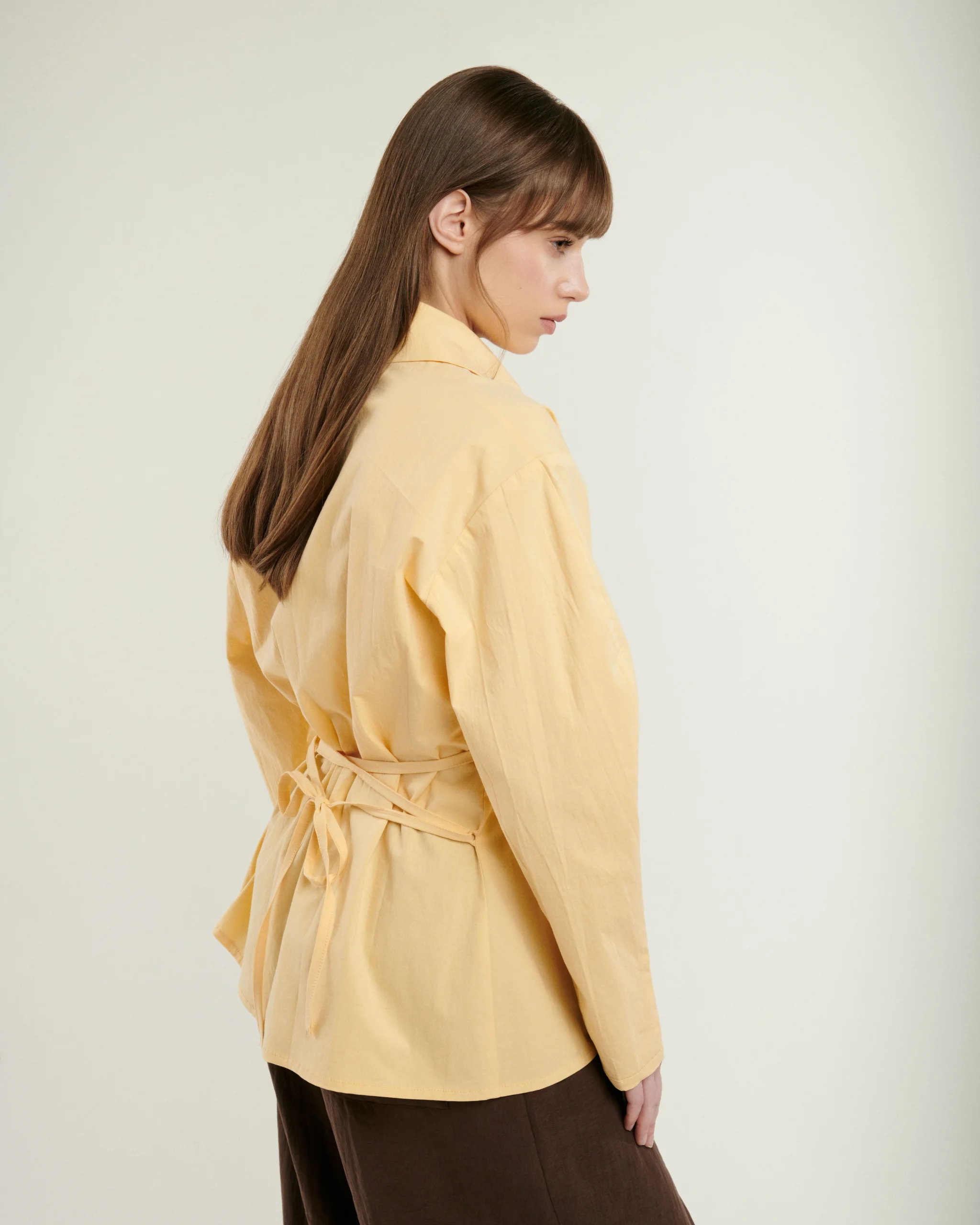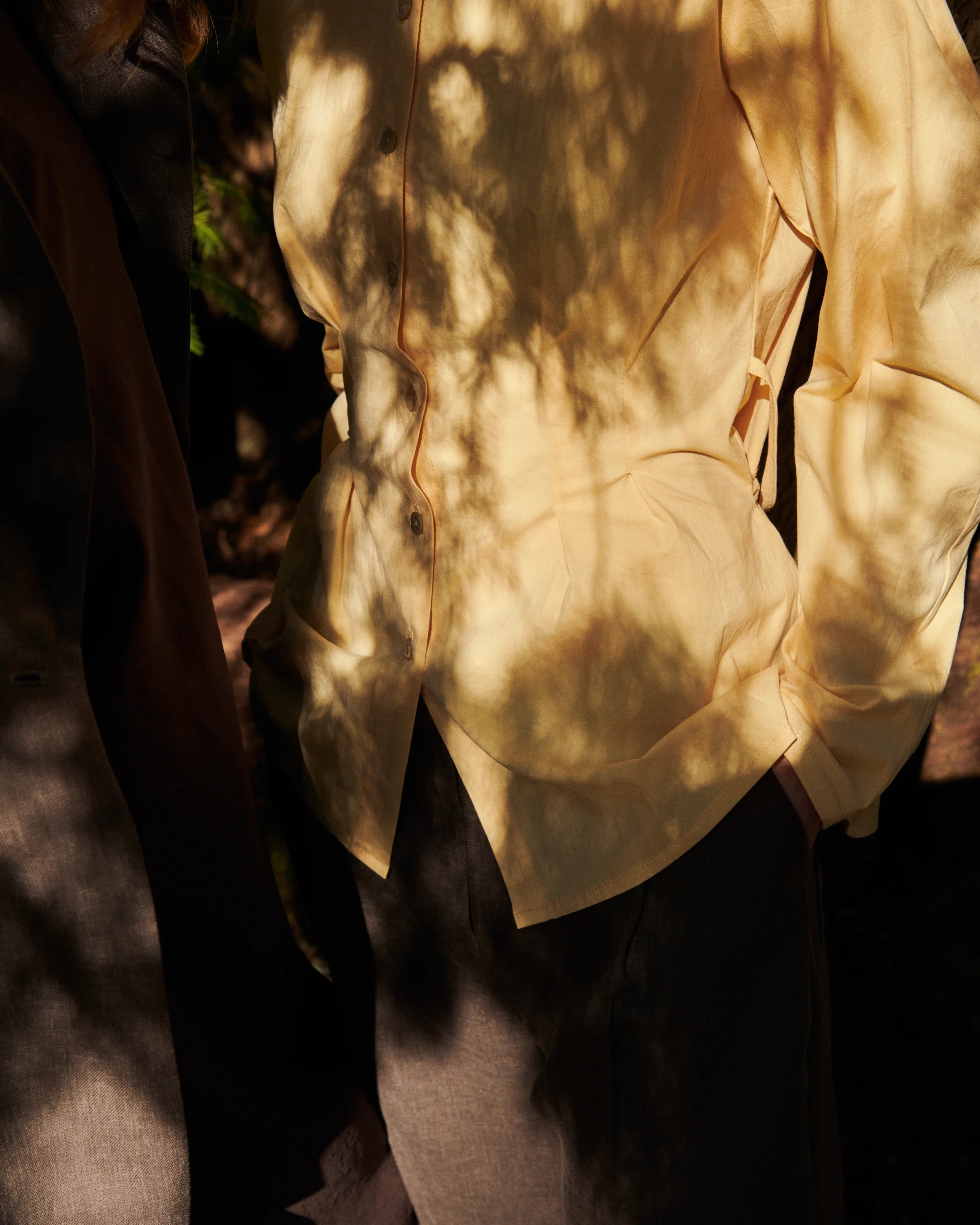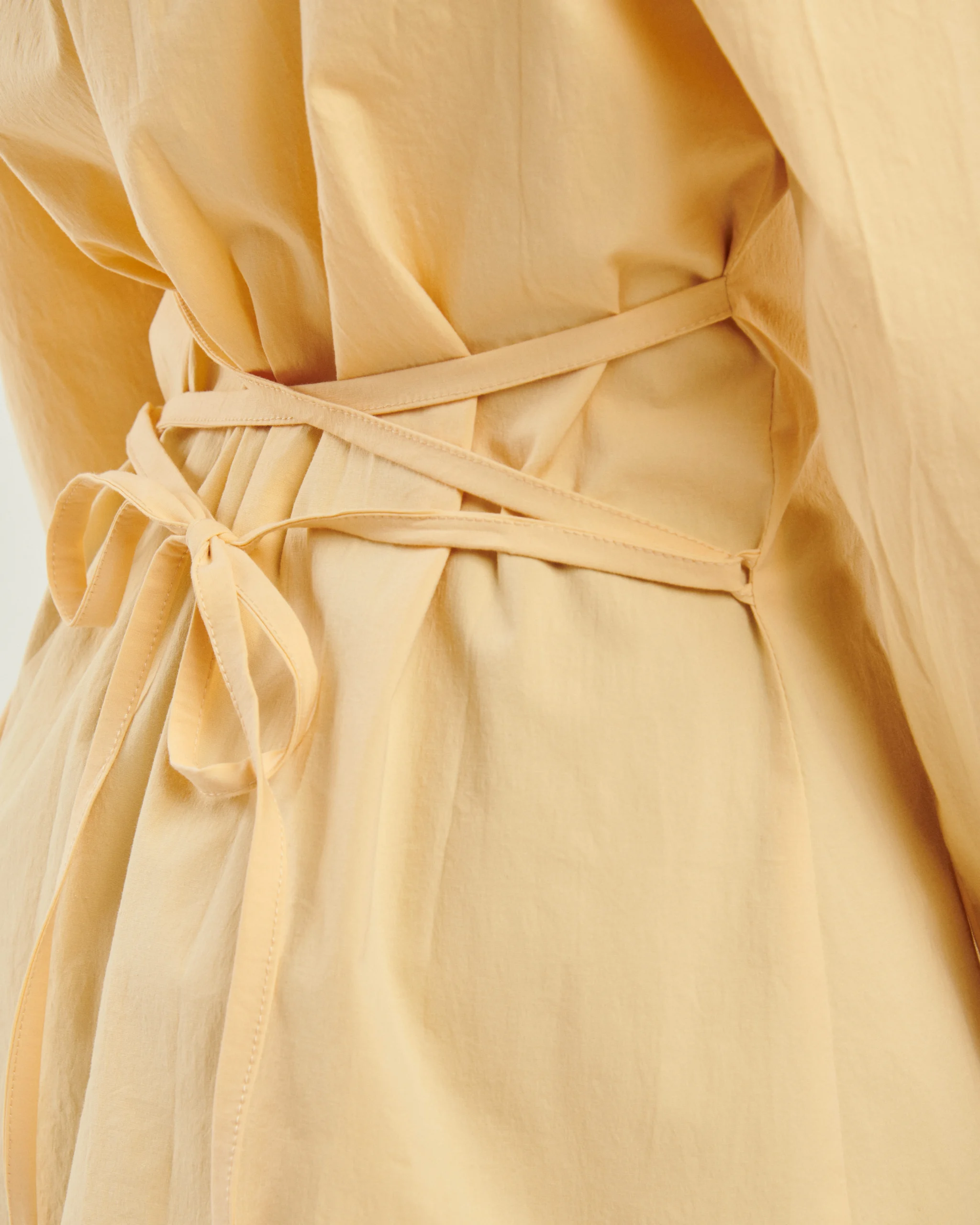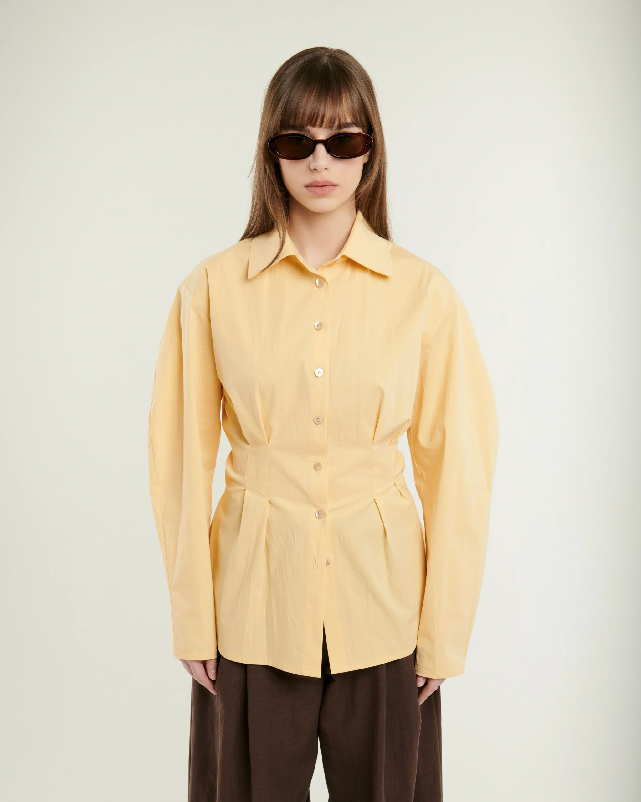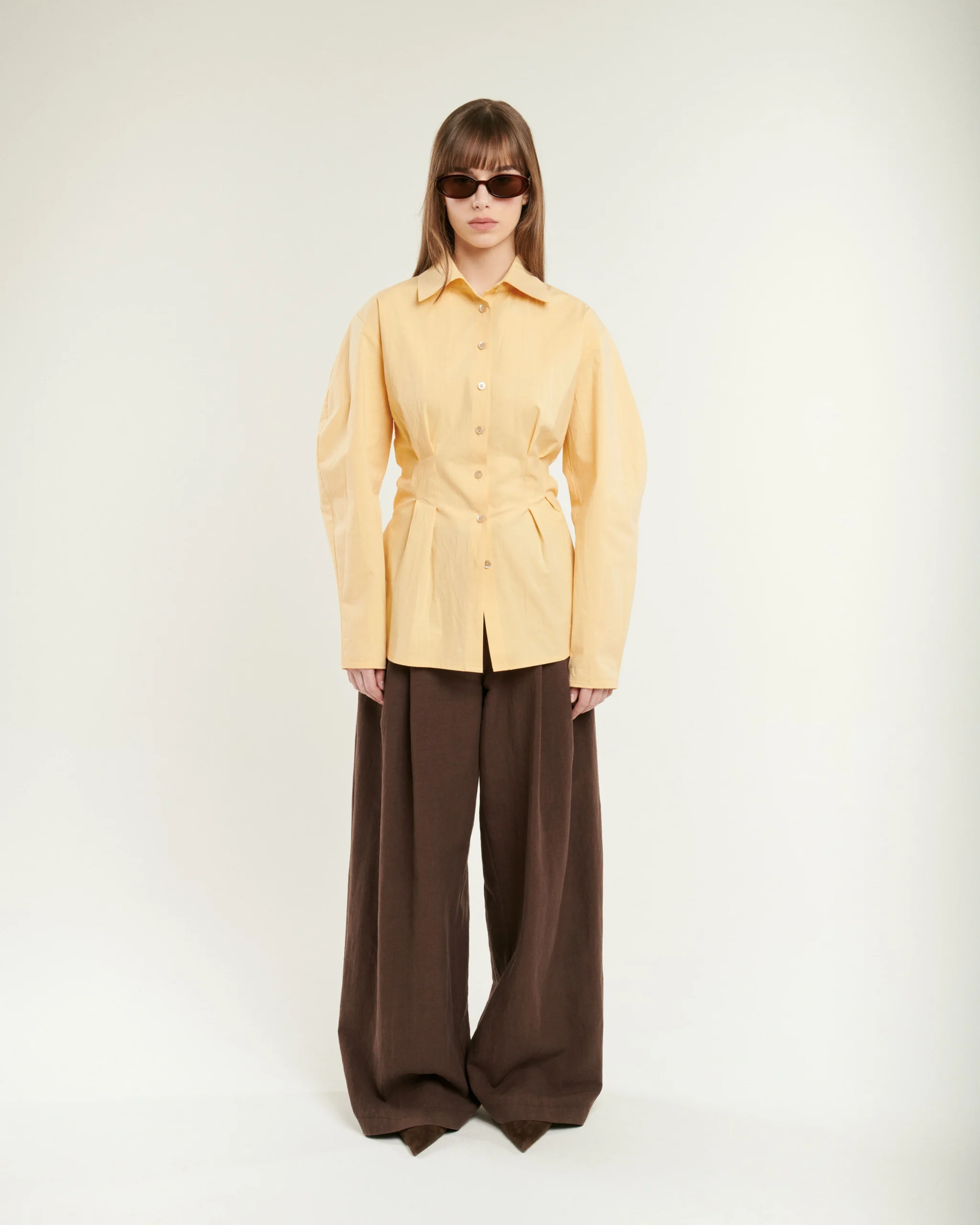 Košeľa z elastického bavlneného popelínu v teplej medovej farbe. Spredu tvarovaná v páse — silueta je ženská aj bez akéhokoľvek úsilia. Zozadu šnúrka, ktorou si stiahnutie nastavíte presne podľa seba. Balónový rukáv dodáva strihu objem a odľahčuje celkovo konzervatívnejší tvar košele. Klasický golier a gombíky vpredu udržiavajú celok čistý a neokázalý.
