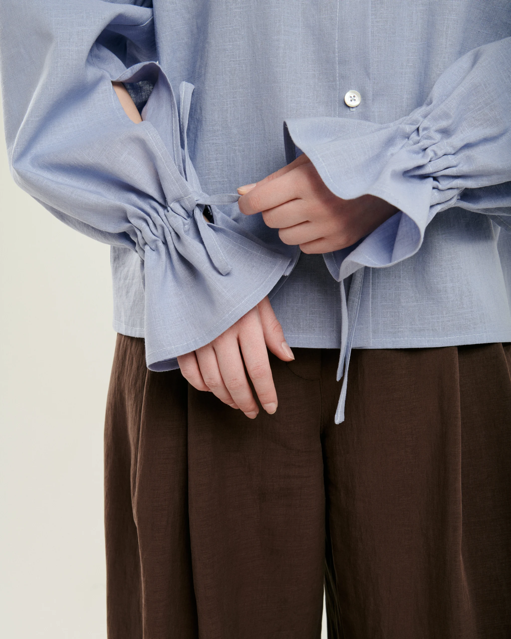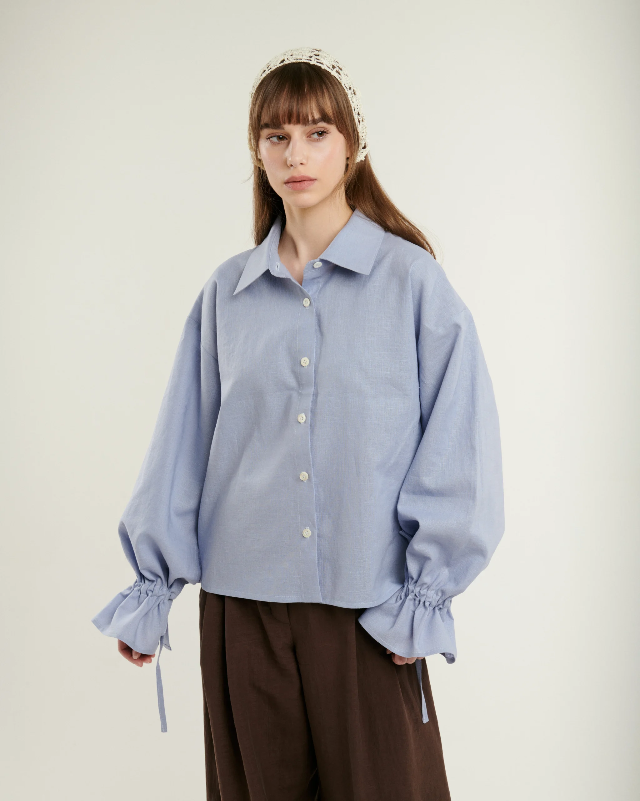 Blúzka z ľanu v bledomodrej tlmenej farbe. Voľný strih je navrhnutý tak, aby fungoval dvoma spôsobmi -voľná ku širokým nohaviciam alebo ľahko zasunutá do pásu. Padnutý rukáv s riasením a mašľou pri zápästí dáva blúzke charakter. Na chrbte jemné riasenie, ktoré dodáva strihu pohyb. Materiál dýcha a časom zmäkne.