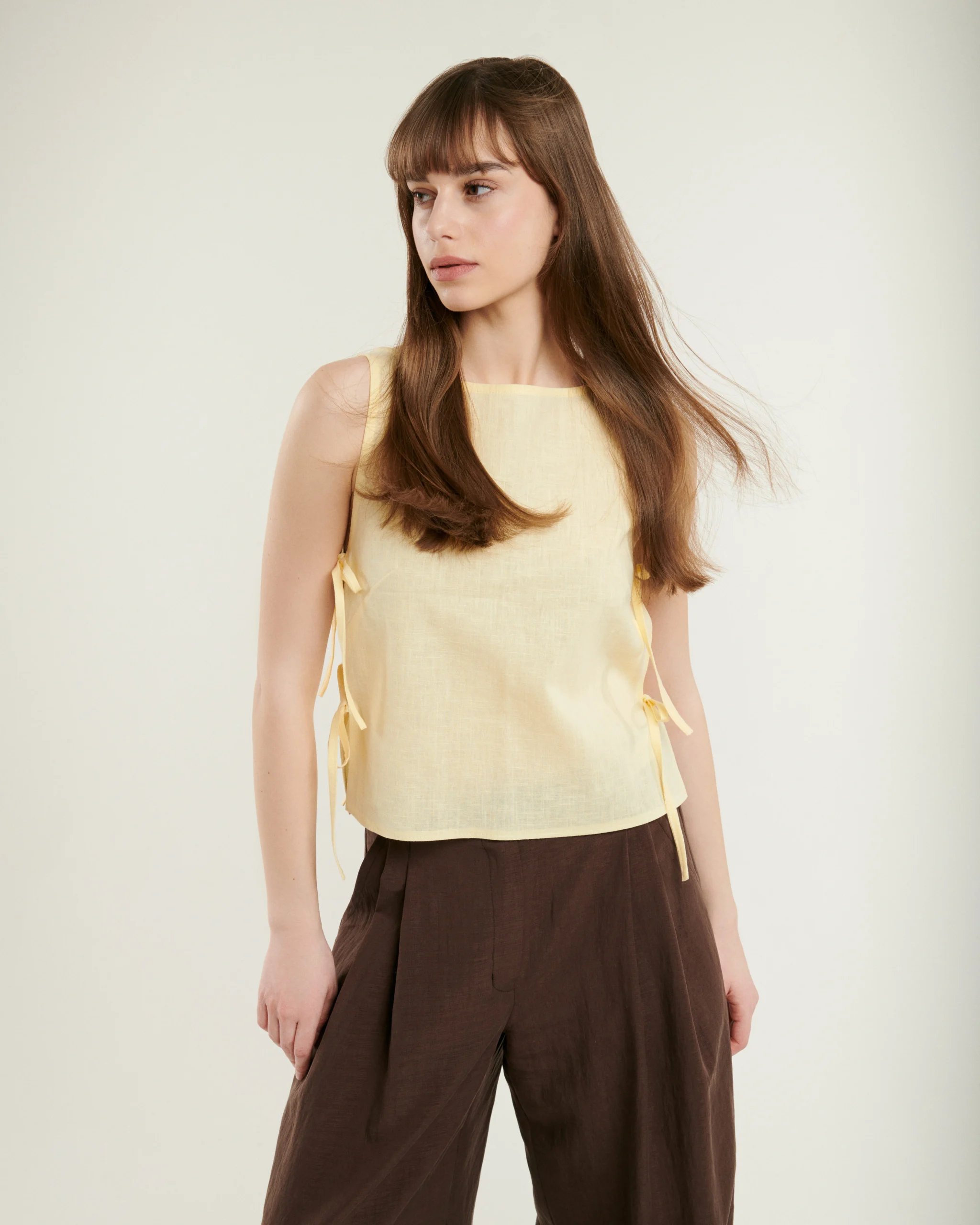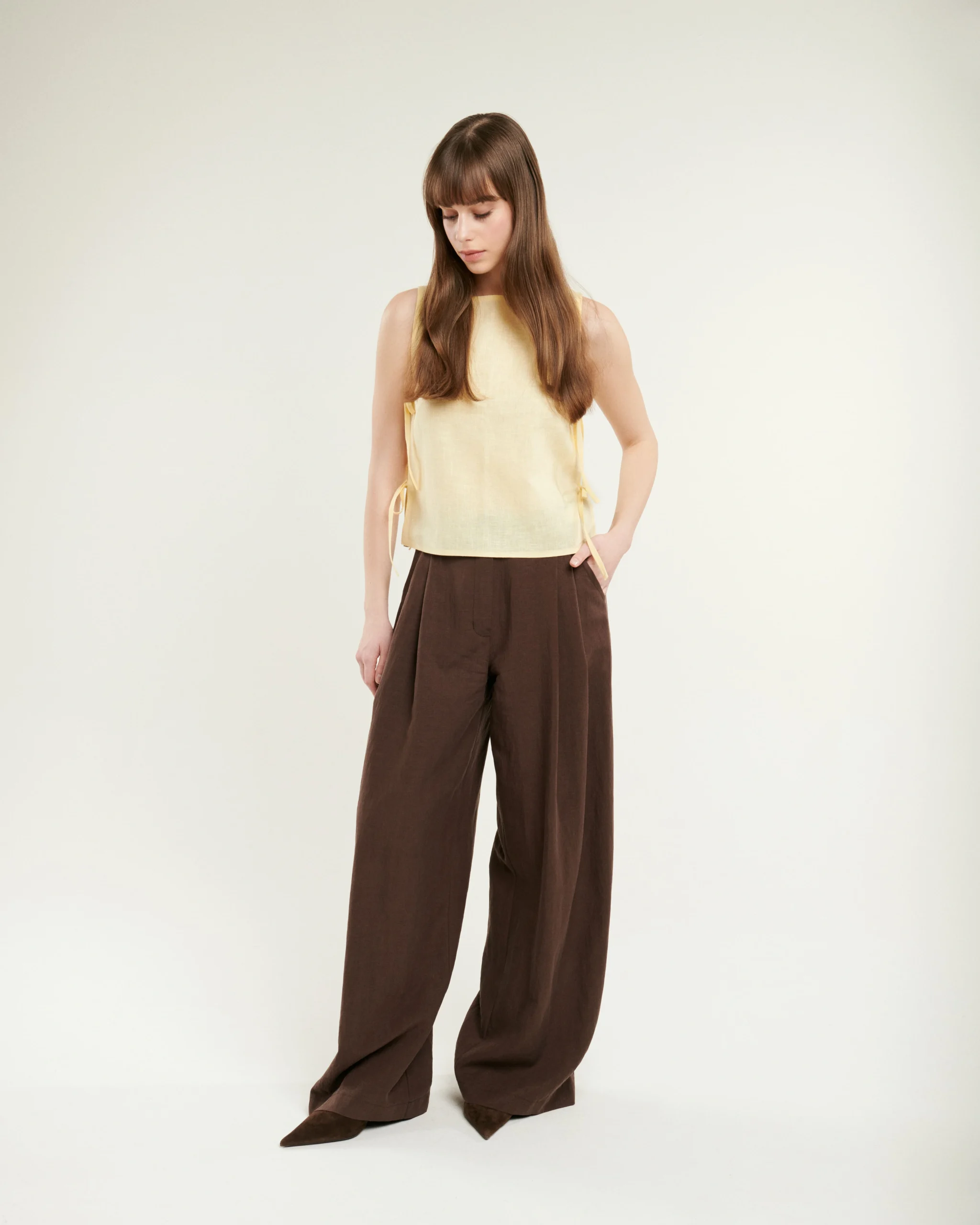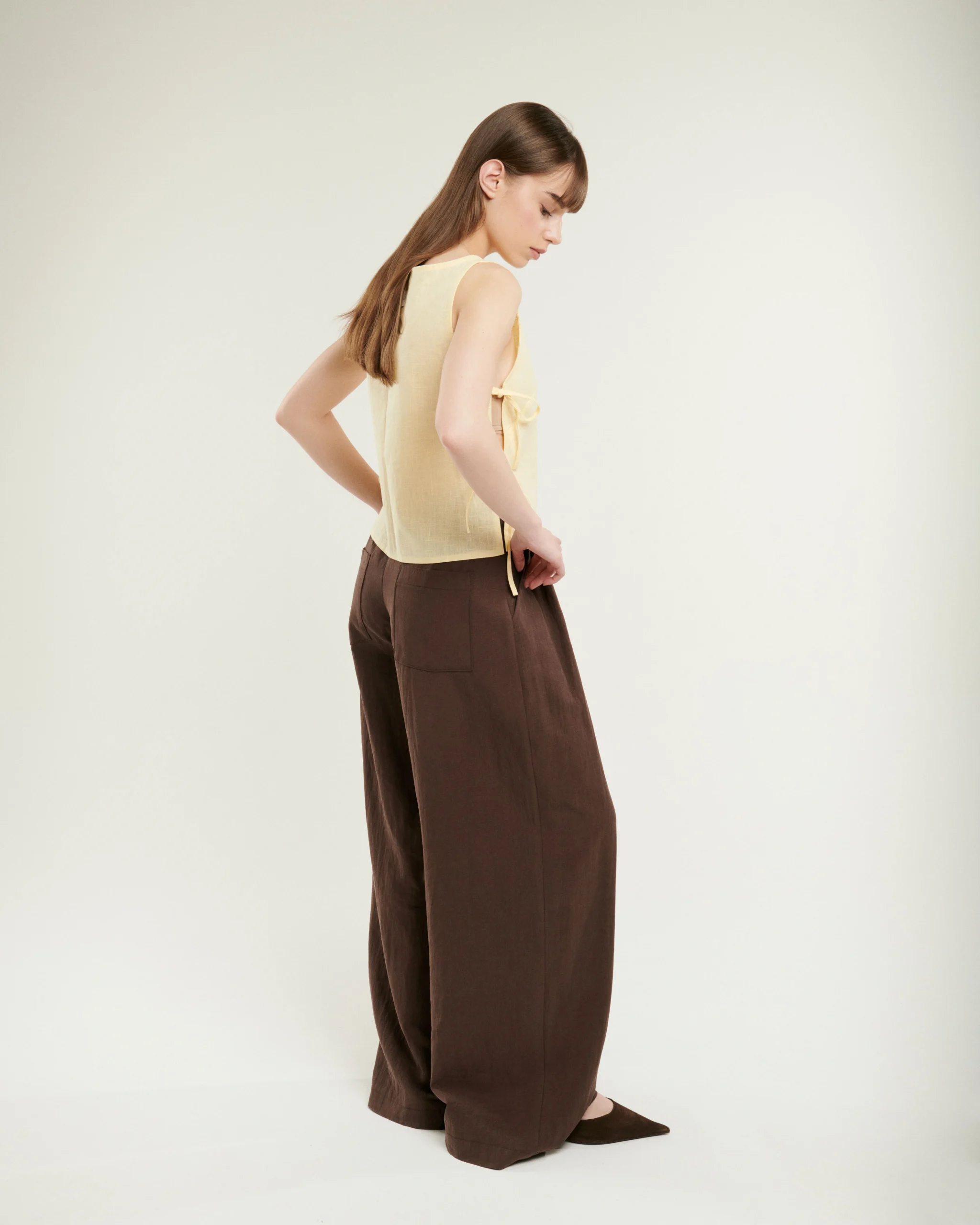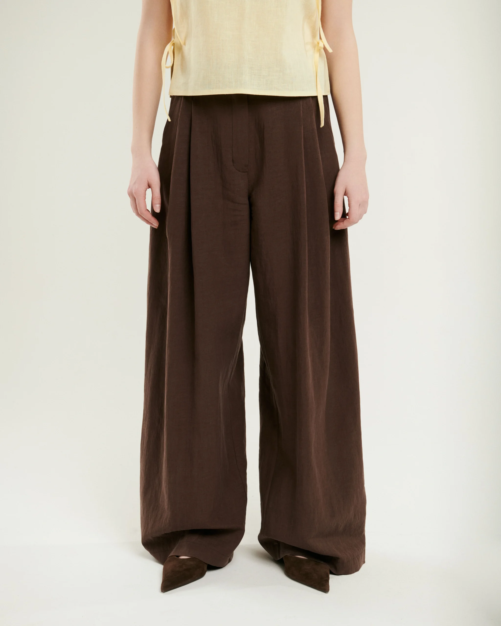 Nohavice zo splývavého tencelu v tmavej čokoládovej farbe. Materiál je prirodzene chladivý a padá presne tak, ako má. Voľný strih so záhybmi vpredu pôsobí upravene aj bez väčšej námahy. Zadný diel s gumou sa pohodlne prispôsobí postave. Hodí sa k topu aj k blúzke.