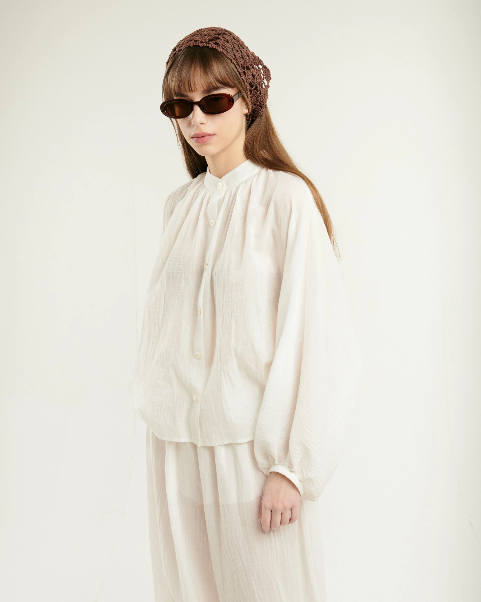 Blúzka z jemnej ecru krešovanej bavlny, ktorá je príjemne tenká a mierne priehľadná. Rukáv plynule prechádza z blúzky a sťahuje sa do manžety- strih, ktorý dáva celku ten charakteristický vzdušný tvar. Voľná silueta, ktorá neobmedzuje. Môže sa kombinovať s nohavicami v rovnakom materiáli.