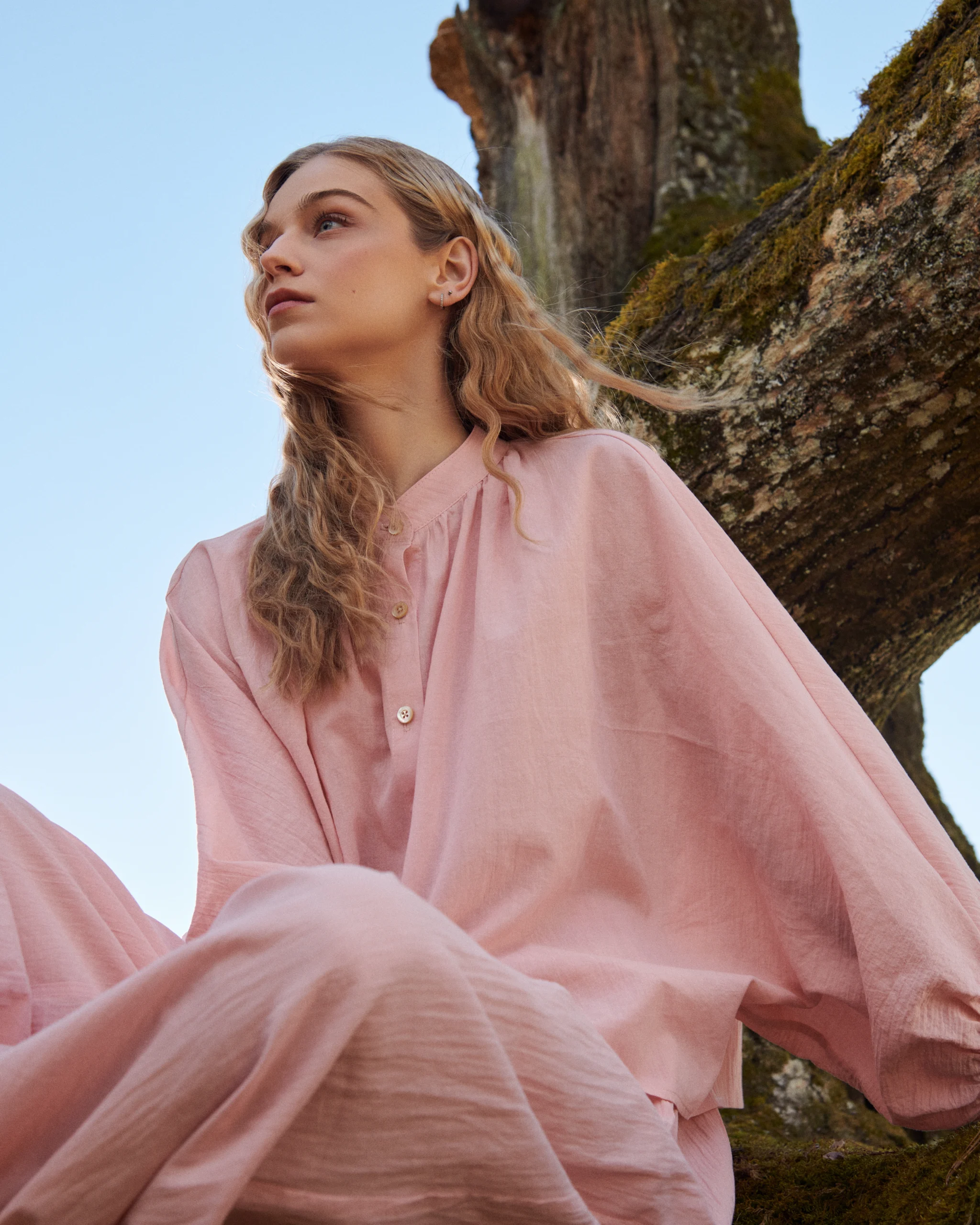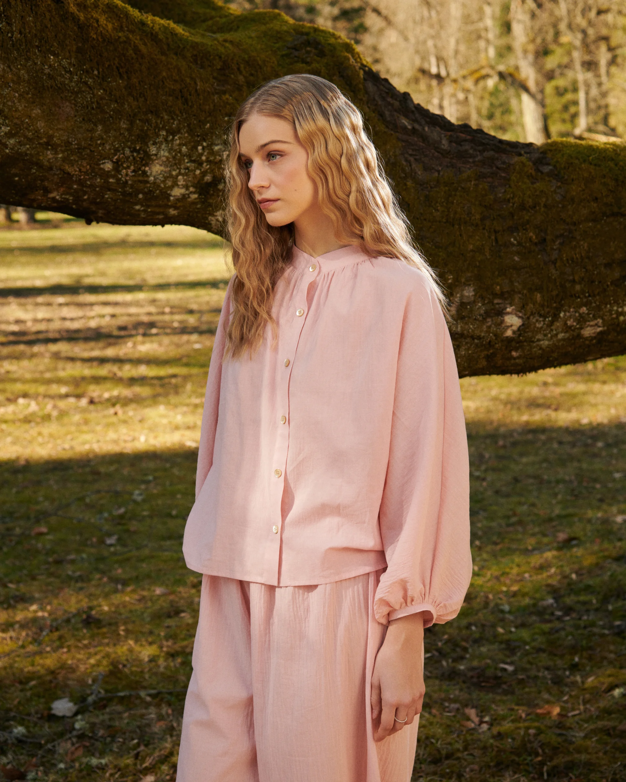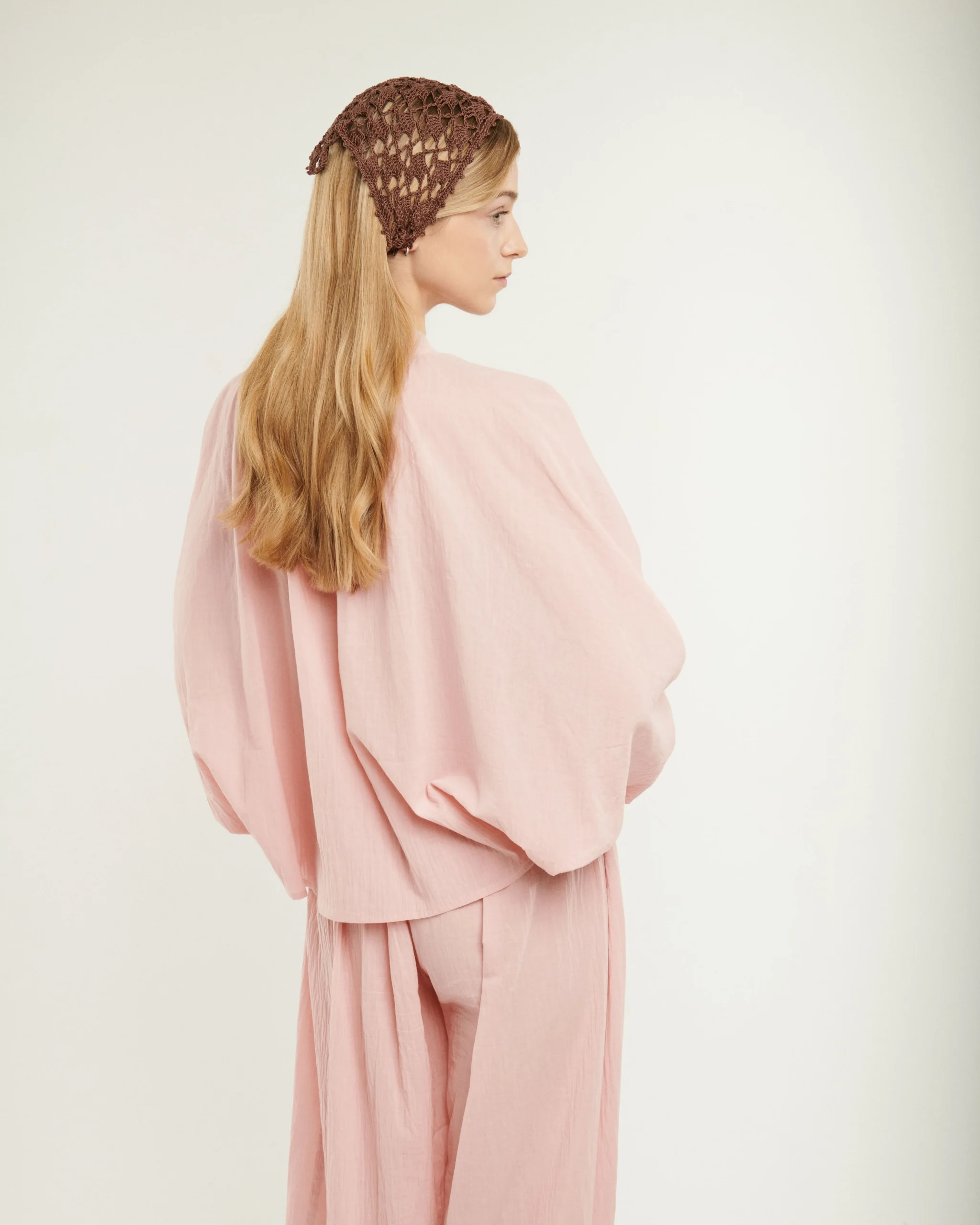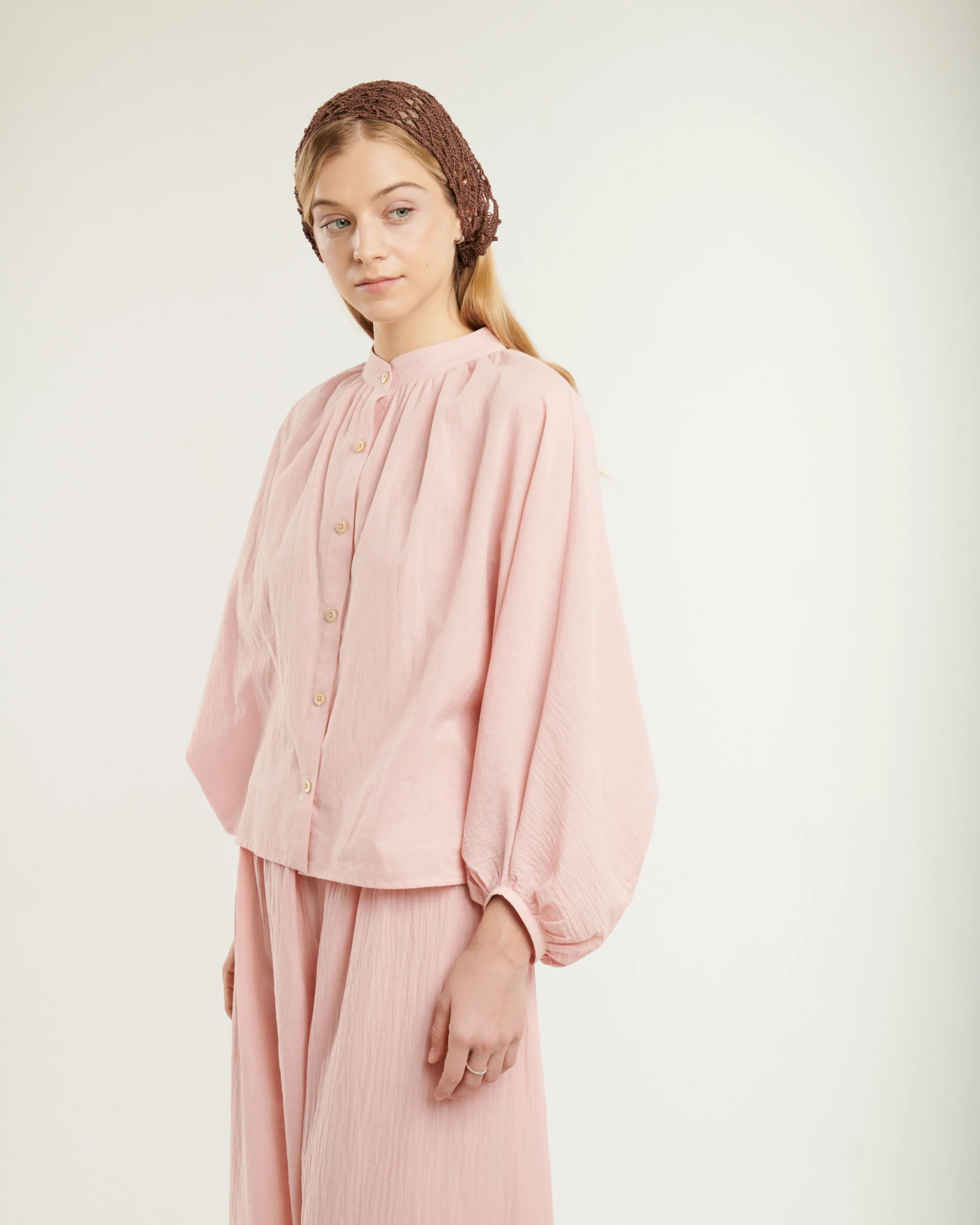 Blúzka z jemnej starorúžovej krešovanej bavlny, ktorá je príjemne tenká a mierne priehľadná. Rukáv plynule prechádza z blúzky a sťahuje sa do manžety- strih, ktorý dáva celku ten charakteristický vzdušný tvar. Voľná silueta, ktorá neobmedzuje. Môže sa kombinovať s nohavicami v rovnakom materiáli.
